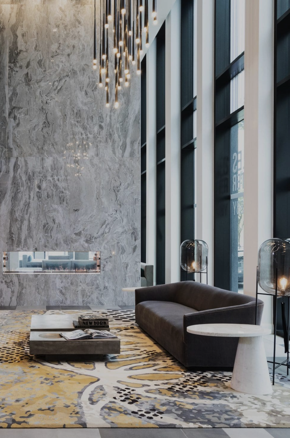 The Marlowe’s exterior design, crafted by Nina Magon Studio, features a striking interplay of sleek black and white glass panels that echo the sophistication of a tailored pinstripe suit.